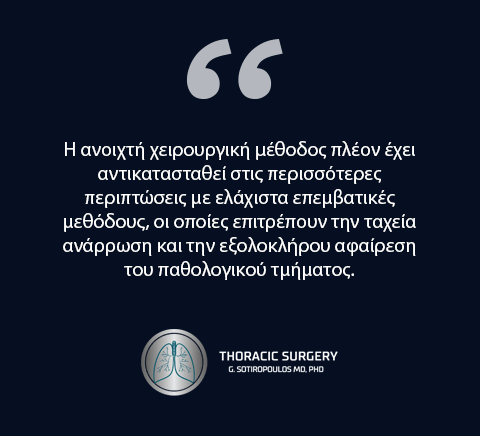 - Θωρακοσκοπική χειρουργική μεθόδος (VATS) : Αποτελεί μια ελάχιστα επεμβατική χειρουργική μέθοδο, κατά την οποία ο θωρακοχειρουργός σχηματίζει μικρές τομές στο θώρακα. Από τις τομές αυτές εισέρχεται το θωρακοσκόπιο, δηλαδή μία ειδική κάμερα και τα χειρουργικά εργαλεία, προκειμένου να ανιχνευτεί και να αφαιρεθεί το παθολογικό τμήμα, αποφεύγοντας έτσι τη διενέργεια θωρακοτομής.